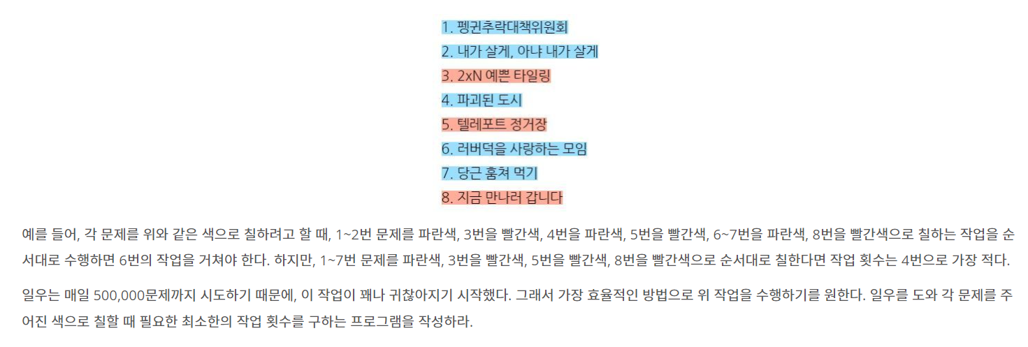 neighbor 블로그를 운영하는 일우는 매일 아침 풀고 싶은 문제를 미리 정해놓고 글을 올린다. 그리고 매일 밤 각각의 문제에 대하여, 해결한 경우 파란색, 해결하지 못한 경우 빨간색으로 칠한