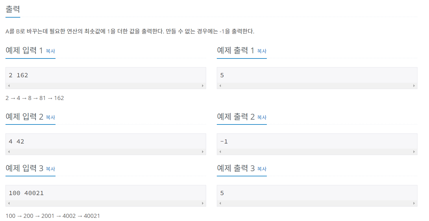 첫째 줄에 A, B (1 ≤ A < B ≤ 109)가 주어진다.