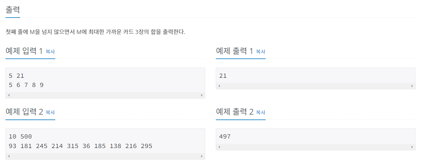 첫째 줄에 카드의 개수 N(3 ≤ N ≤ 100)과 M(10 ≤ M ≤ 300,000)이 주어진다. 둘째 줄에는 카드에 쓰여 있는 수가 주어지며, 이 값은 100,000을 넘지 않는 양의 정수이다. 합이 M을 넘지 않는 카드 3장