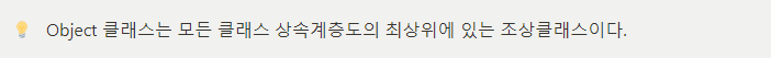 - 다른 클래스로부터 상속을 받지 않는 모든 클래스는 자동적으로 Object클래스로부터 상속받는다.