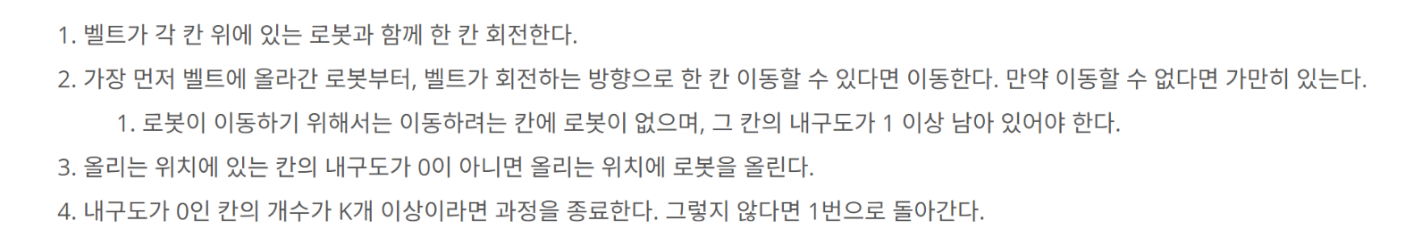 1. 문제 조건을 잘못 해석해서 디버깅을 하는데 상당한 시간이 소요되었다. 컨베이어 벨트 끝에 있는 로봇은 그 다음 벨트로 넘어갈 때, 내구도를 감소시키지 않는다. 감소시키는 케이스로 지문을 잘못 해석해서 오류를 찾질 못했다. 지문을 좀 더 자세히 읽어보자
