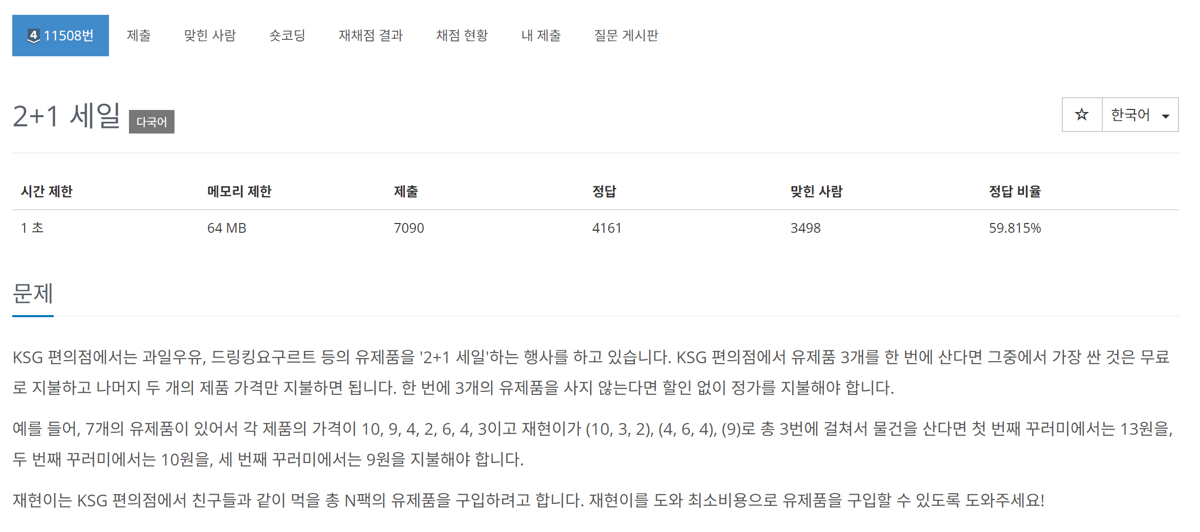 KSG 편의점에서는 과일우유, 드링킹요구르트 등의 유제품을 '2+1 세일'하는 행사를 하고 있습니다. KSG 편의점에서 유제품 3개를 한 번에 산다면 그중에서 가장 싼 것은 무료로 지불하고 나머지 두