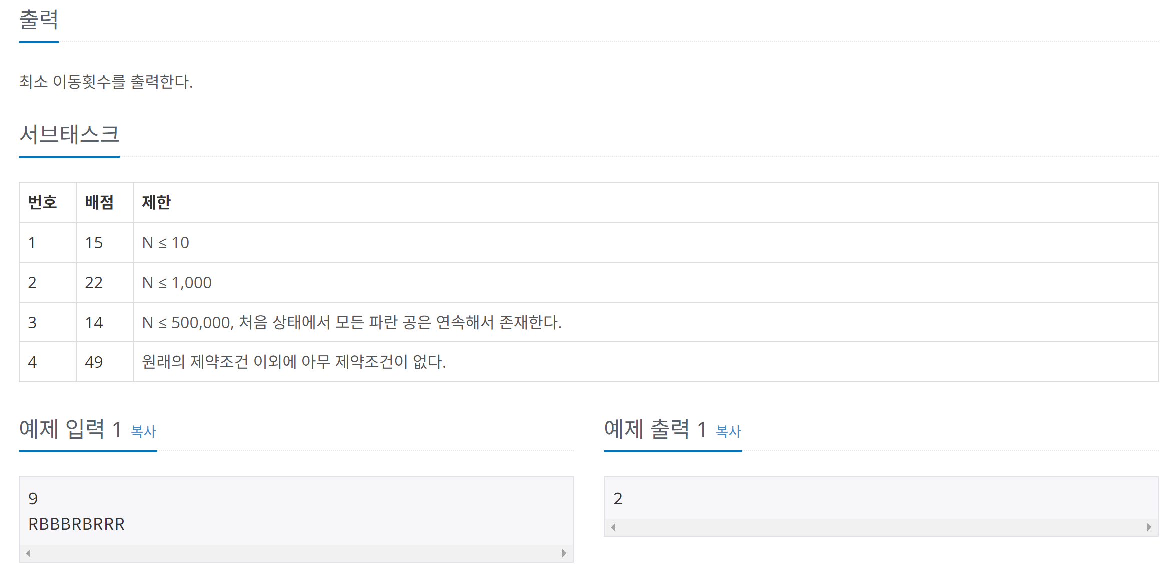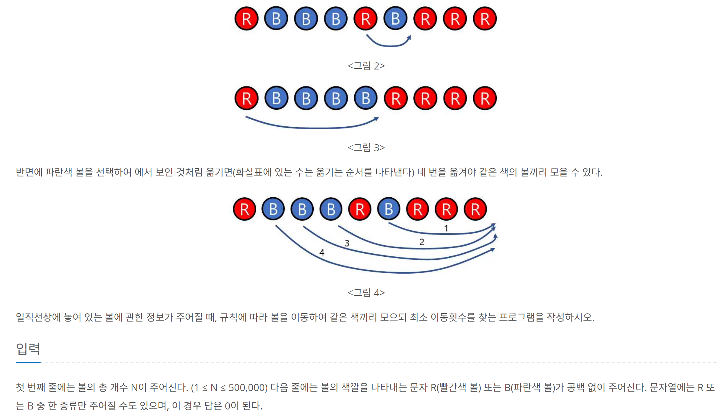 첫 번째 줄에는 볼의 총 개수 N이 주어진다. (1 ≤ N ≤ 500,000) 다음 줄에는 볼의 색깔을 나타내는 문자 R(빨간색 볼) 또는 B(파란색 볼)가 공백 없이 주어진다. 문자열에는 R 또는 B 중 한 종류만 주