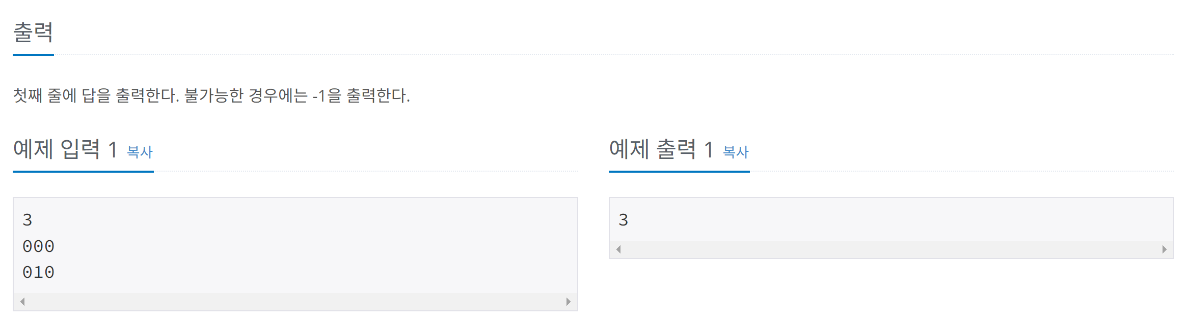 N개의 스위치와 N개의 전구가 있다. 각각의 전구는 켜져 있는 상태와 꺼져 있는 상태 중 하나의 상태를 가진다. i(1 < i < N)번 스위치를 누르면 i-1, i, i+1의 세 개의 전구의 상태가 바뀐다. 즉, 꺼져