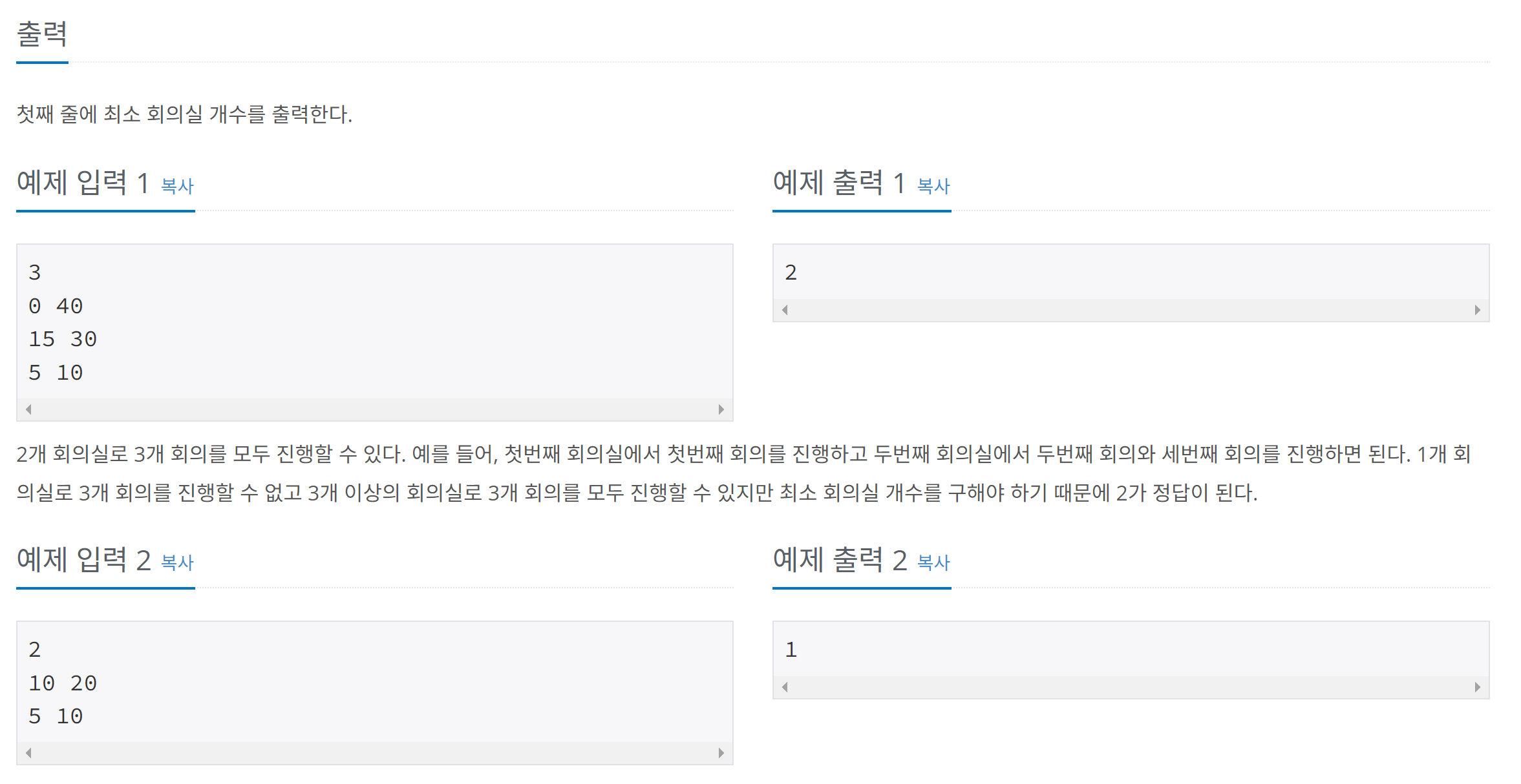일단 문제를 해석하자면 이전 실버 1 문제의 회의실 배정과 비슷하다.