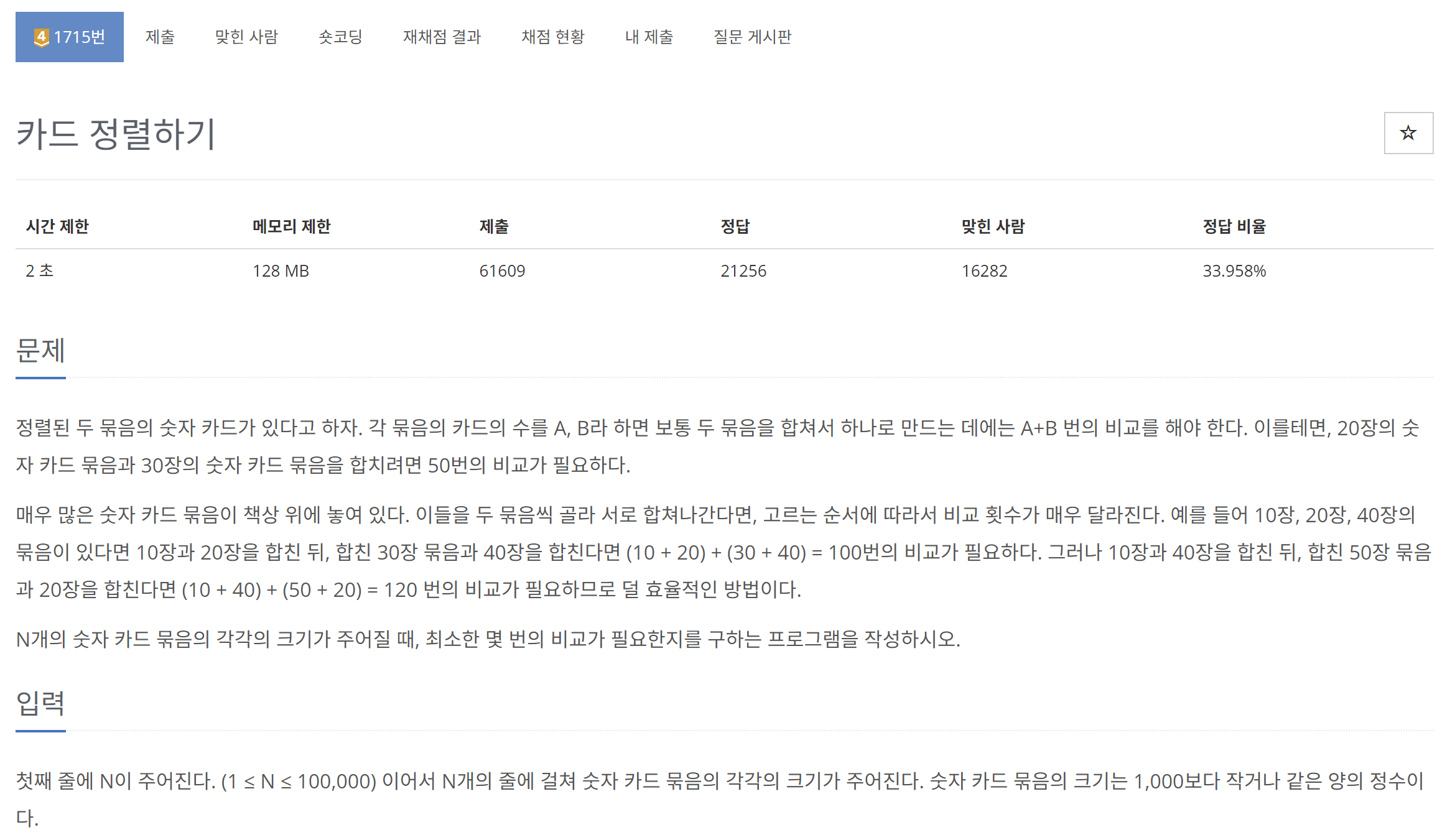 정렬된 두 묶음의 숫자 카드가 있다고 하자. 각 묶음의 카드의 수를 A, B라 하면 보통 두 묶음을 합쳐서 하나로 만드는 데에는 A+B 번의 비교를 해야 한다. 이를테면, 20장의 숫자 카드 묶음과 30장