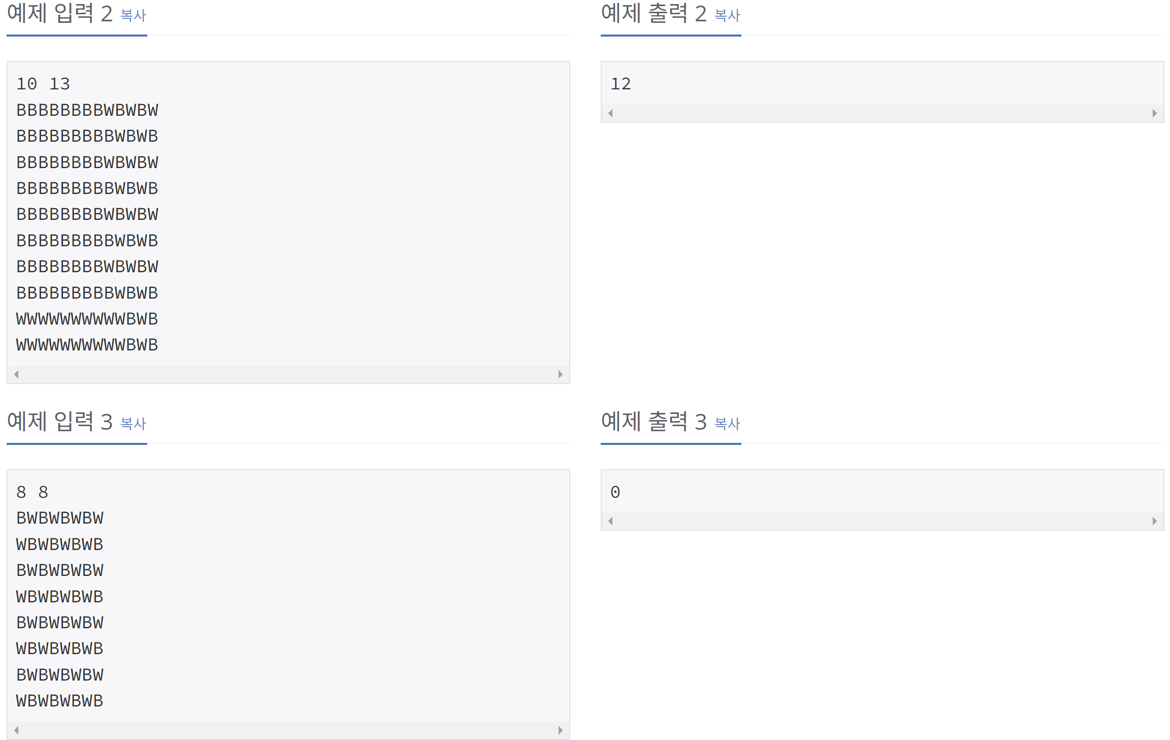 첫째 줄에 N과 M이 주어진다. N과 M은 8보다 크거나 같고, 50보다 작거나 같은 자연수이다. 둘째 줄부터 N개의 줄에는 보드의 각 행의 상태가 주어진다. B는 검은색이며, W는 흰색이다.