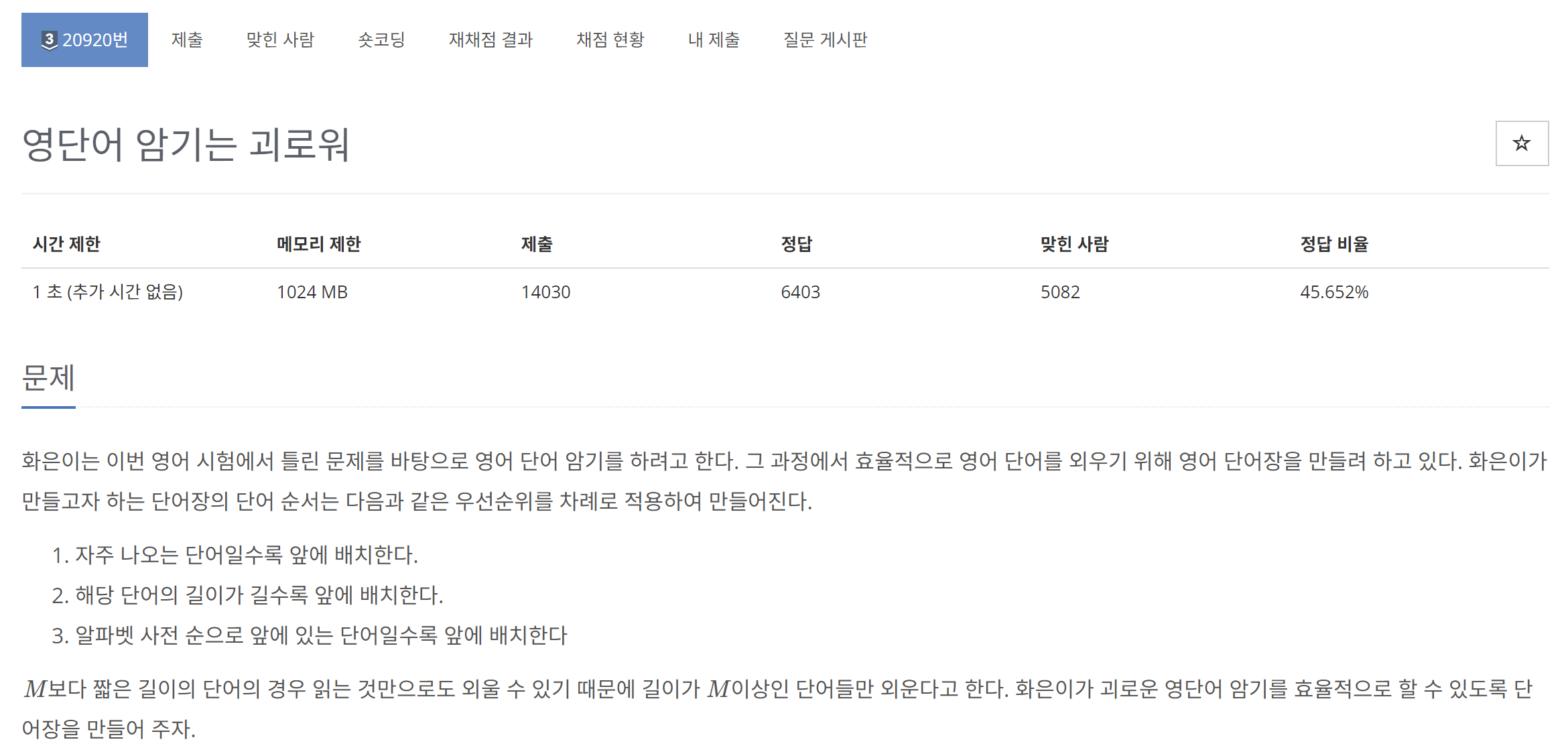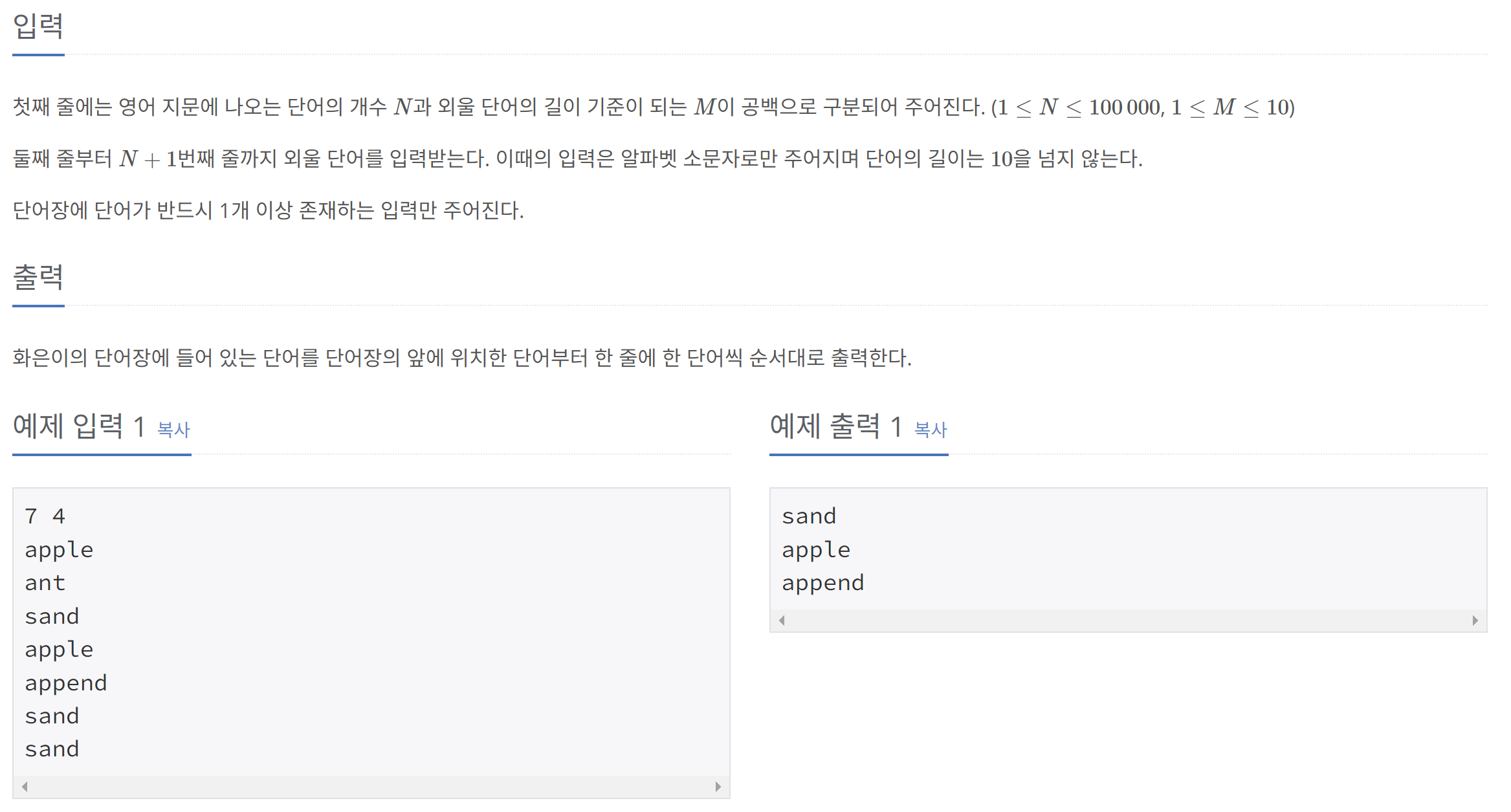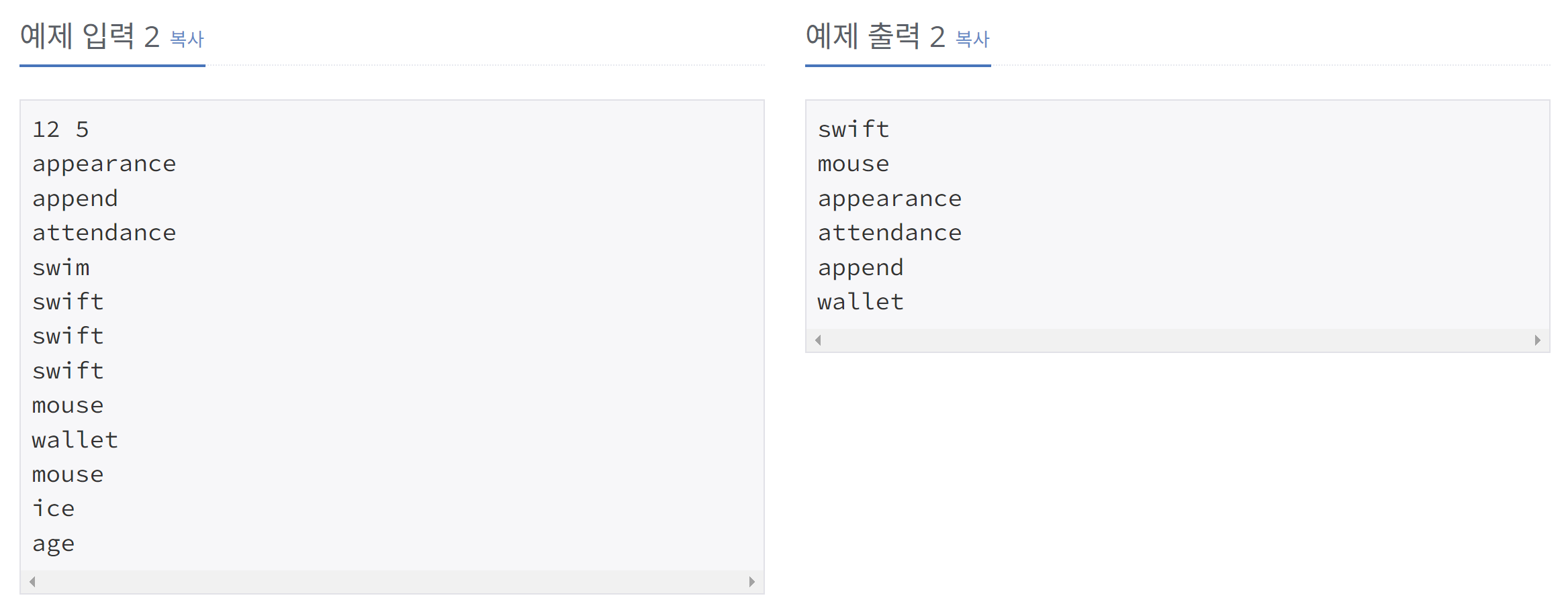 첫째 줄에는 영어 지문에 나오는 단어의 개수 $N$과 외울 단어의 길이 기준이 되는 $M$이 공백으로 구분되어 주어진다. ($1 \leq N \leq 100\,000$, $1 \leq M \leq 10$) 둘째 줄부터 $N+1$번째 줄까지 외울 단