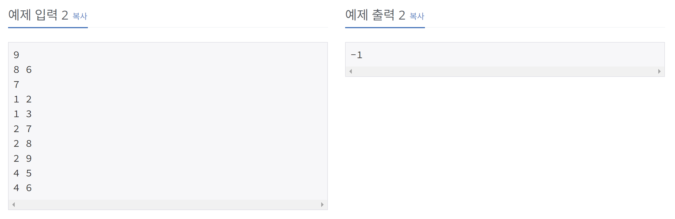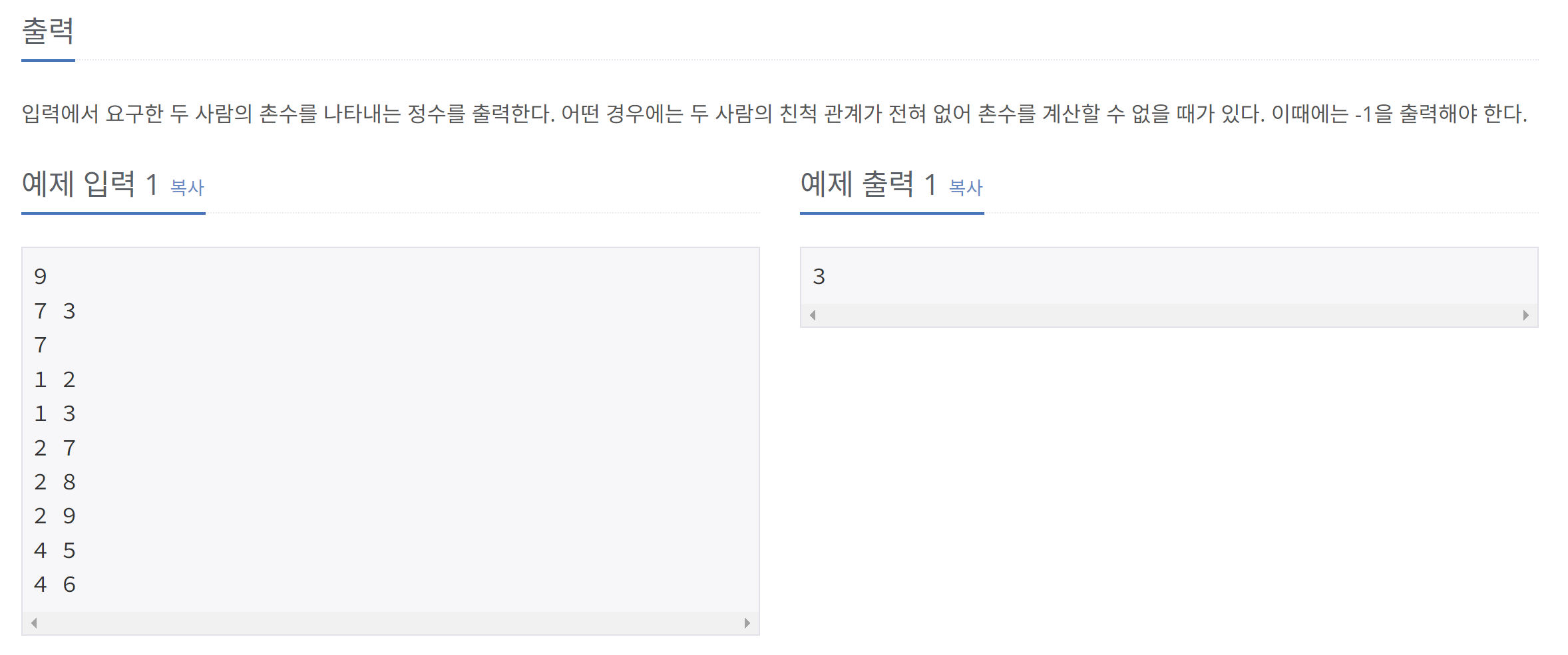 사람들은 1, 2, 3, …, n (1 ≤ n ≤ 100)의 연속된 번호로 각각 표시된다. 입력 파일의 첫째 줄에는 전체 사람의 수 n이 주어지고, 둘째 줄에는 촌수를 계산해야 하는 서로 다른 두 사람의 번호가 주어