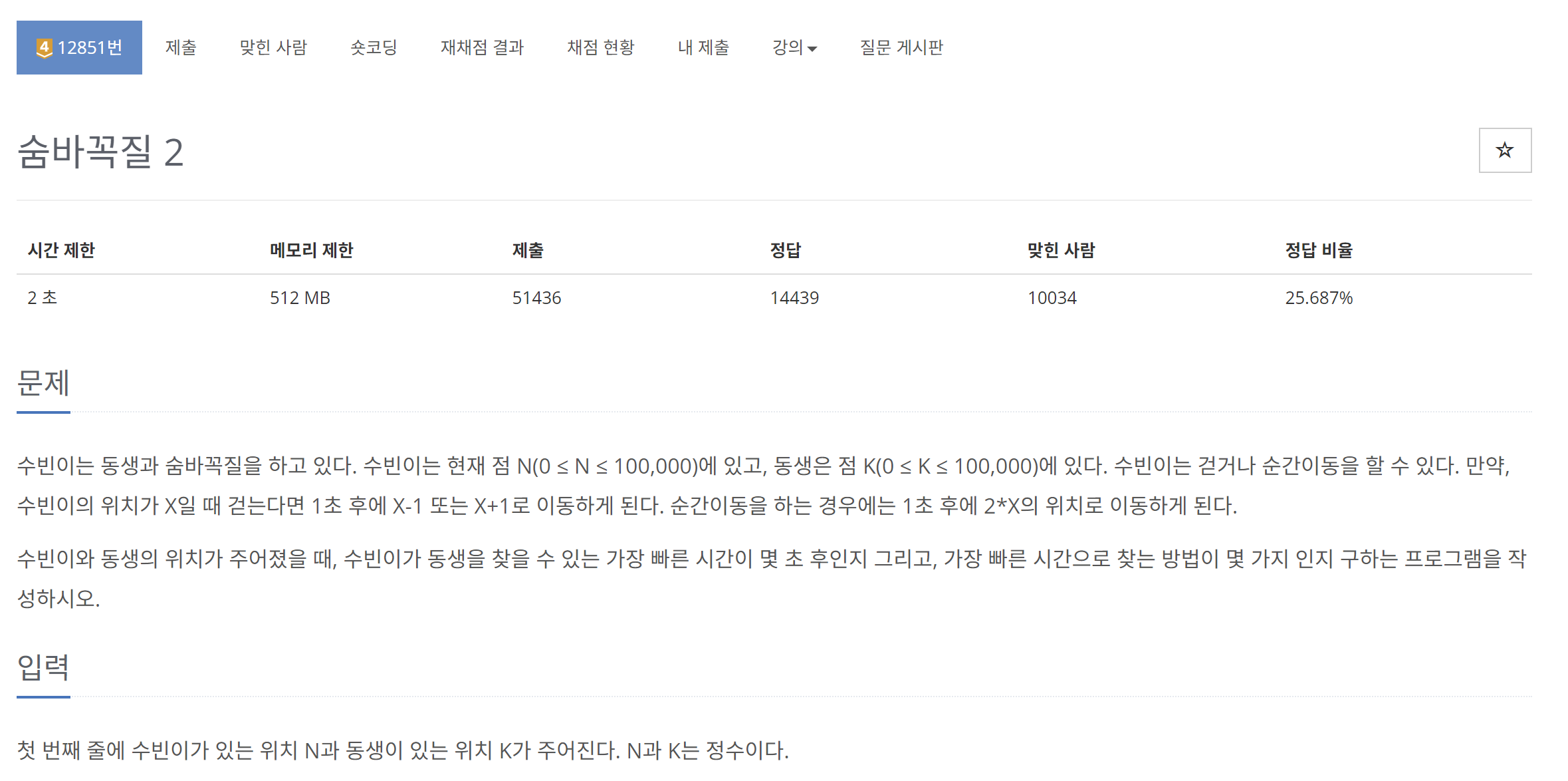 수빈이는 동생과 숨바꼭질을 하고 있다. 수빈이는 현재 점 N(0 ≤ N ≤ 100,000)에 있고, 동생은 점 K(0 ≤ K ≤ 100,000)에 있다. 수빈이는 걷거나 순간이동을 할 수 있다. 만약, 수빈이의 위치가 X일 때