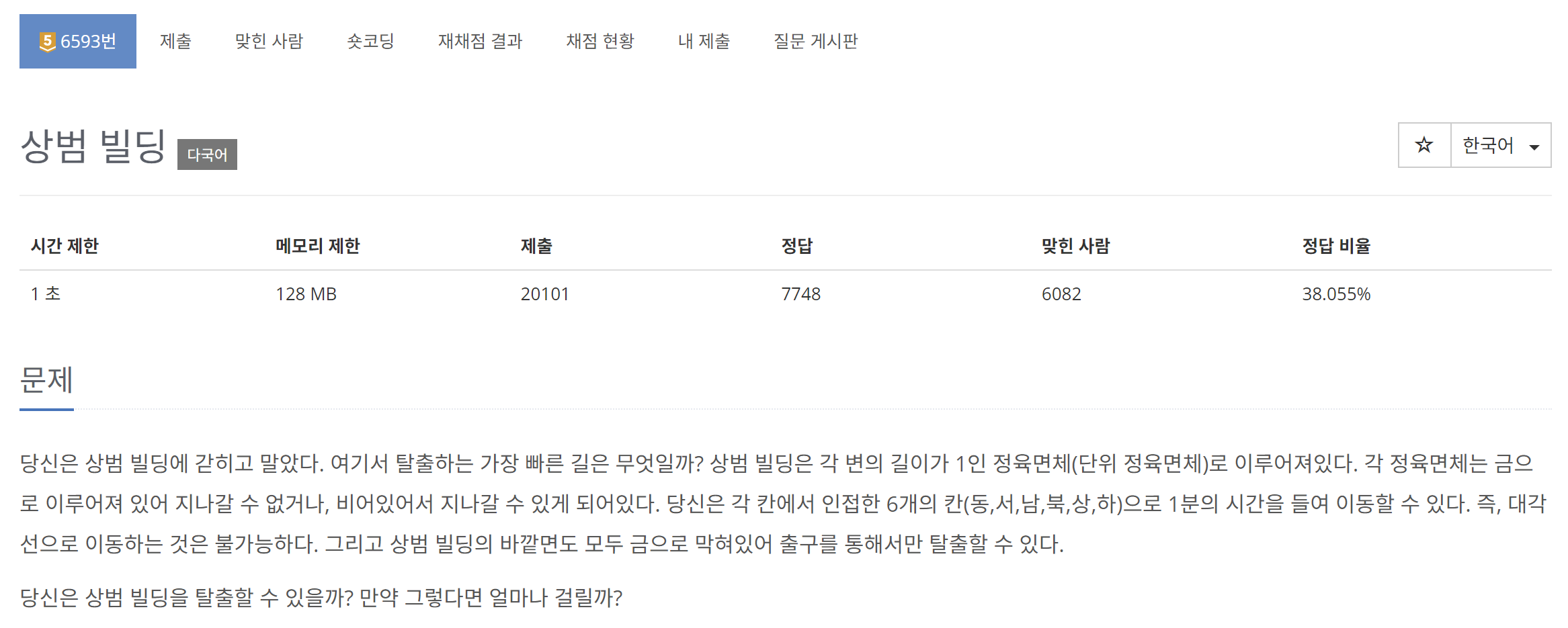 당신은 상범 빌딩에 갇히고 말았다. 여기서 탈출하는 가장 빠른 길은 무엇일까? 상범 빌딩은 각 변의 길이가 1인 정육면체(단위 정육면체)로 이루어져있다. 각 정육면체는 금으로 이루어져 있어