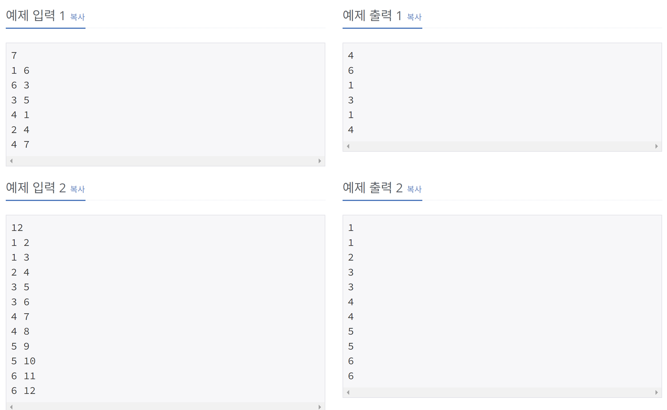 루트 없는 트리가 주어진다. 이때, 트리의 루트를 1이라고 정했을 때, 각 노드의 부모를 구하는 프로그램을 작성하시오.