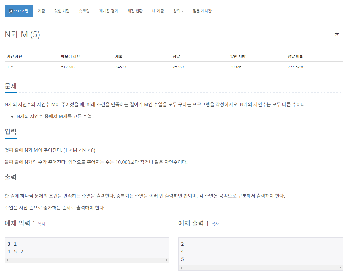 N개의 자연수와 자연수 M이 주어졌을 때, 아래 조건을 만족하는 길이가 M인 수열을 모두 구하는 프로그램을 작성하시오. N개의 자연수는 모두 다른 수이다. N개의 자연수 중에서 M개를 고른 수열