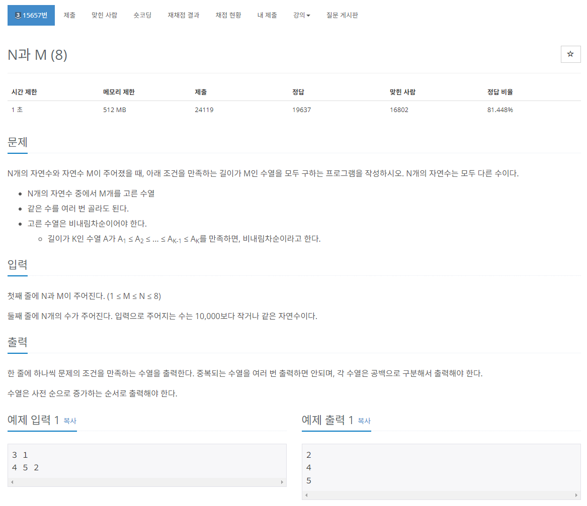 15657번: N과 M (8)