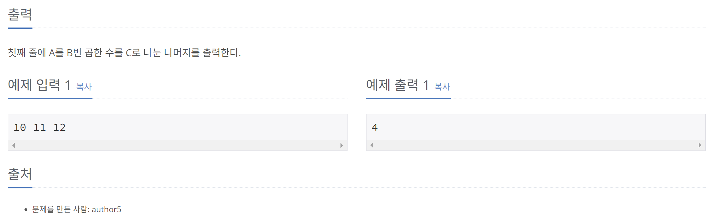 첫째 줄에 A, B, C가 빈 칸을 사이에 두고 순서대로 주어진다. A, B, C는 모두 2,147,483,647 이하의 자연수이다.