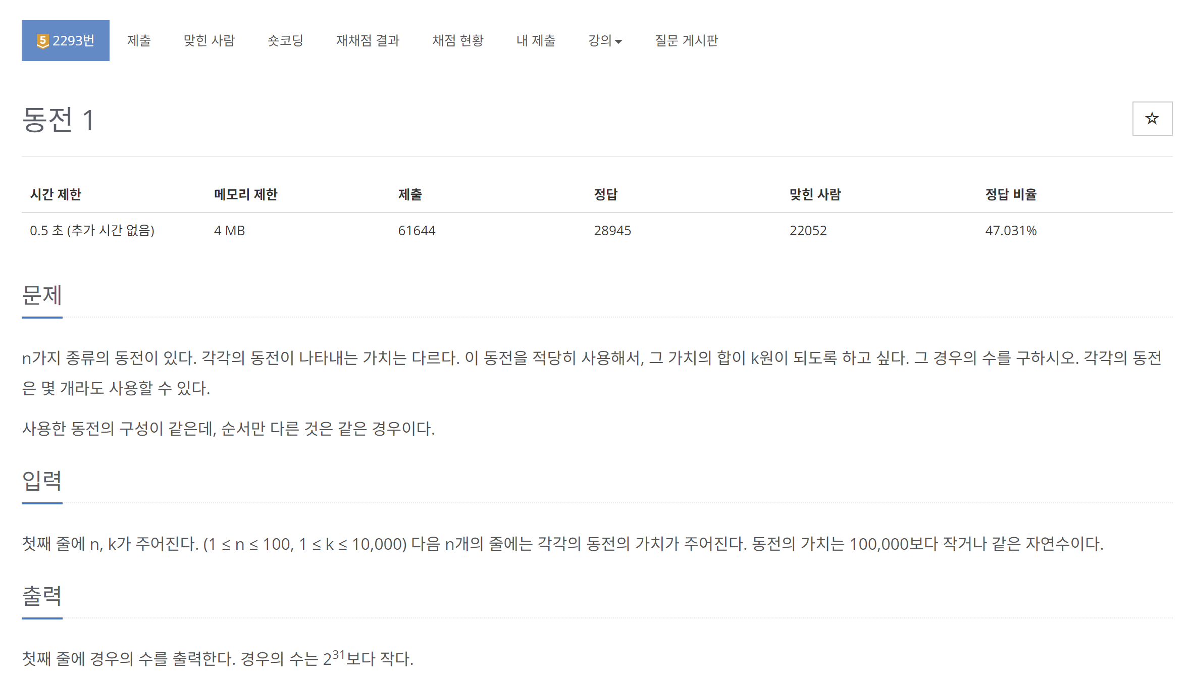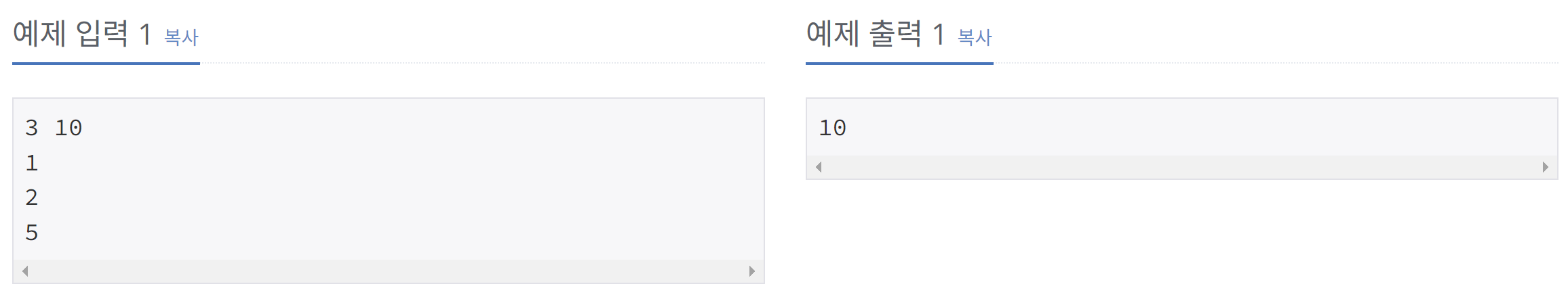 첫째 줄에 n, k가 주어진다. (1 ≤ n ≤ 100, 1 ≤ k ≤ 10,000) 다음 n개의 줄에는 각각의 동전의 가치가 주어진다. 동전의 가치는 100,000보다 작거나 같은 자연수이다.