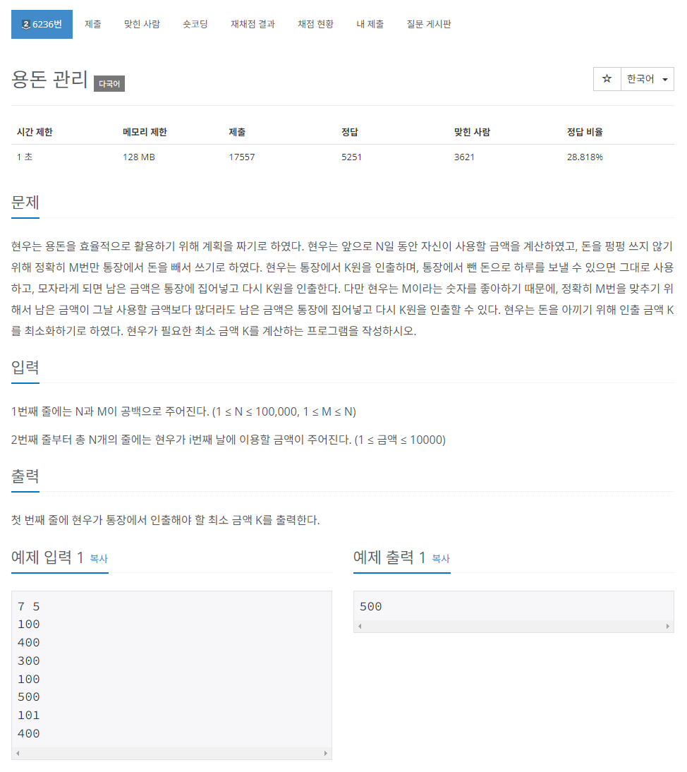 현우는 용돈을 효율적으로 활용하기 위해 계획을 짜기로 하였다. 현우는 앞으로 N일 동안 자신이 사용할 금액을 계산하였고, 돈을 펑펑 쓰지 않기 위해 정확히 M번만 통장에서 돈을 빼서 쓰기로