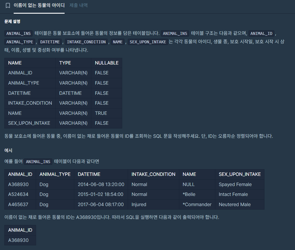 | [SQL/IS NULL] 이름이 있는 동물의 아이디 - 프로그래머스 (0) | 2024.02.12 |