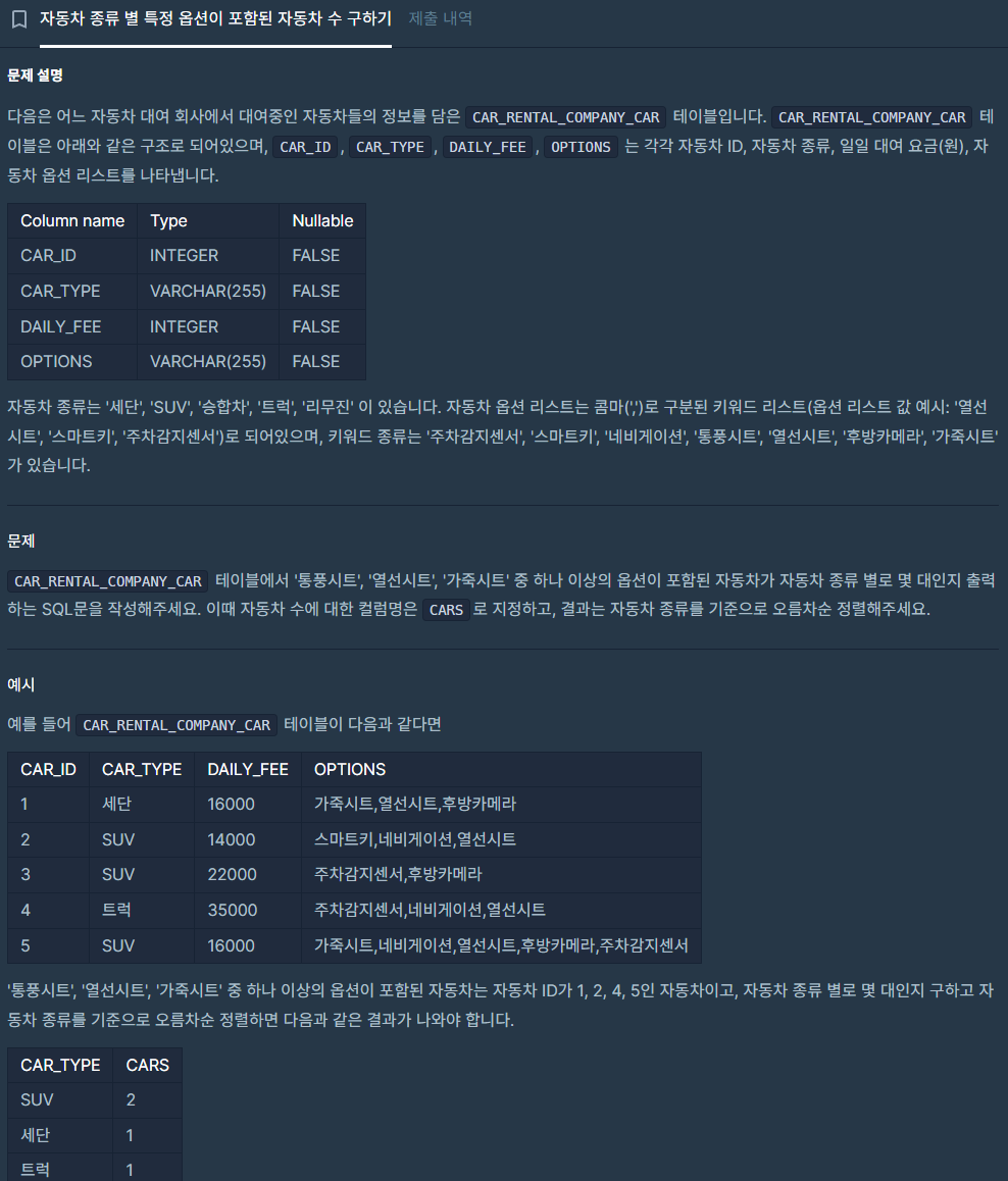 | [SQL/STRING, DATE] 특정 옵션이 포함된 자동차 리스트 구하기 - 프로그래머스 (0) | 2024.02.13 |