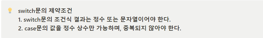 - switch → 처리할 경우가 많은 경우 but, if문보다 제약이 많음