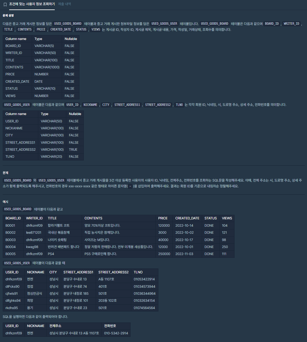 1) 거래 게시물 3건 이상 -> GROUP BY 후 HAVING절을 통해서 3개 이상 추출