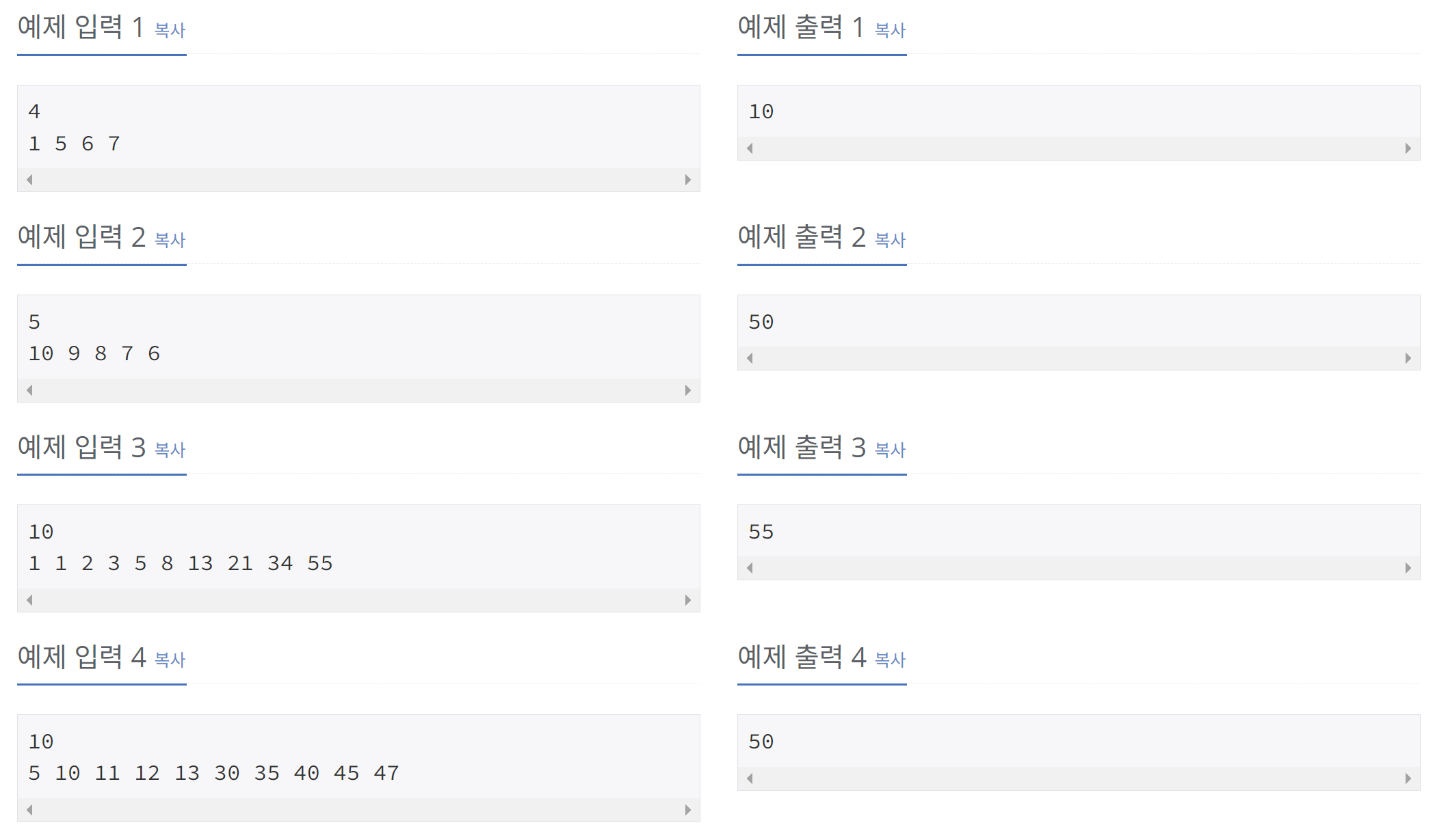 첫째 줄에 민규가 구매하려고 하는 카드의 개수 N이 주어진다. (1 ≤ N ≤ 1,000) 둘째 줄에는 Pi가 P1부터 PN까지 순서대로 주어진다. (1 ≤ Pi ≤ 10,000)