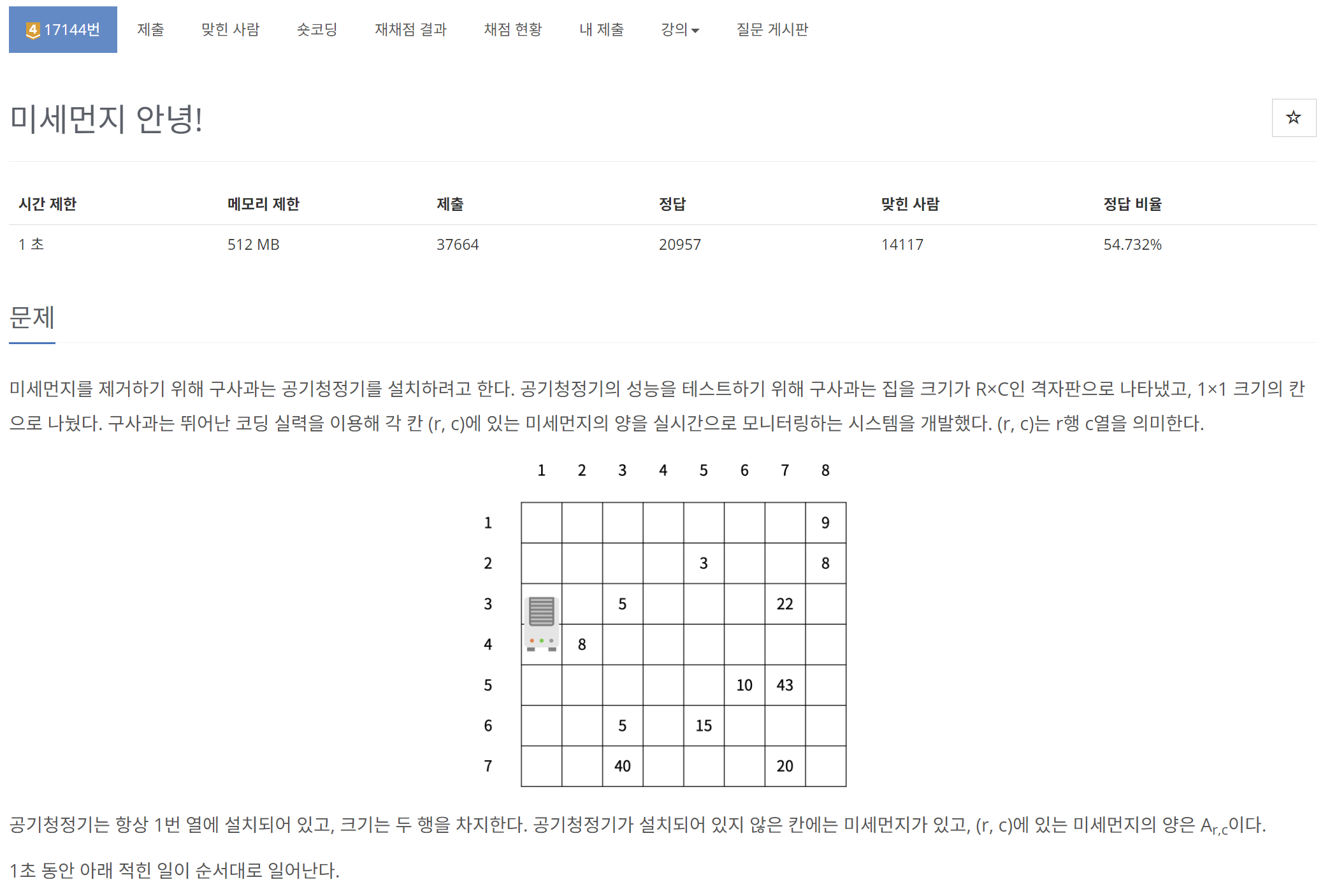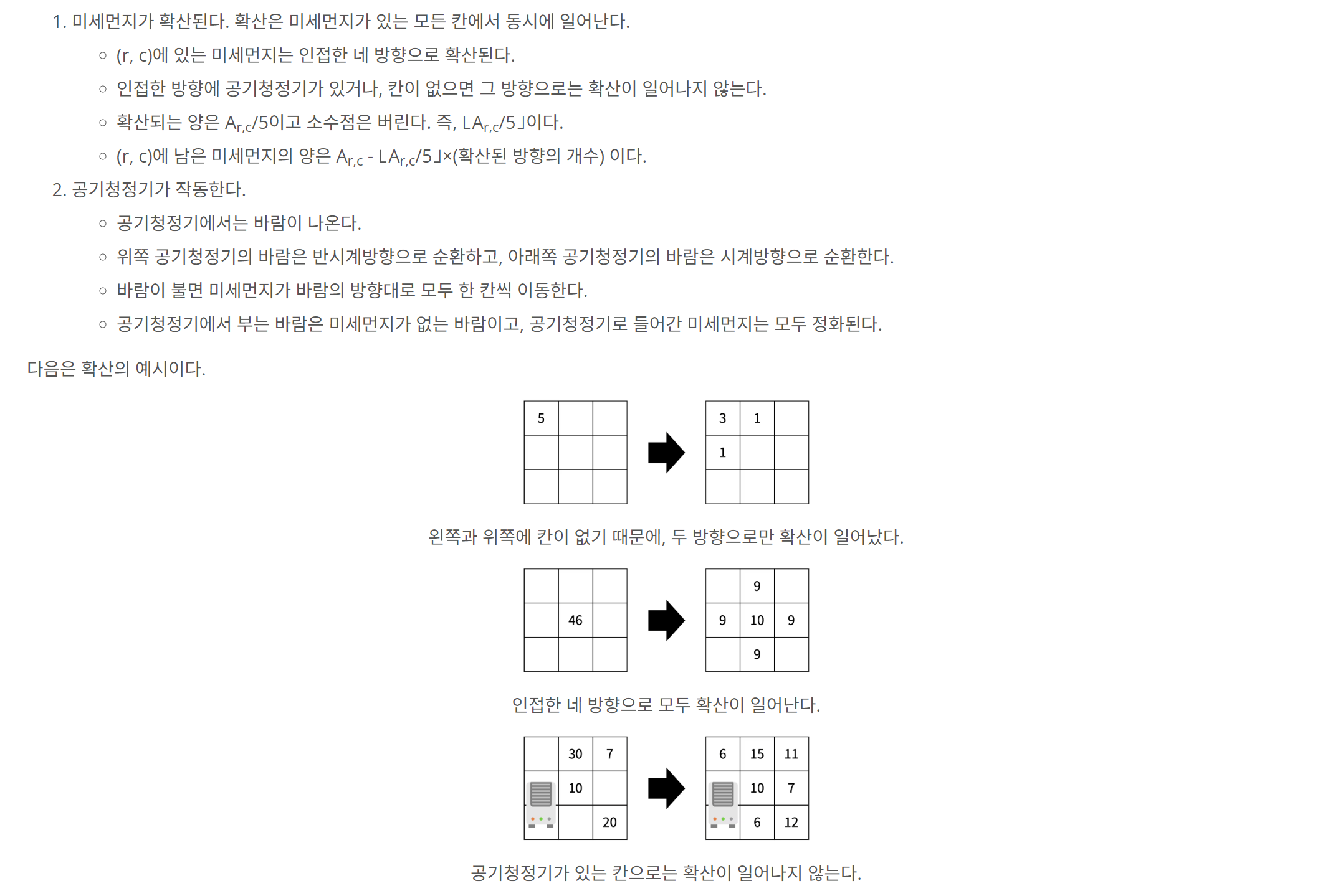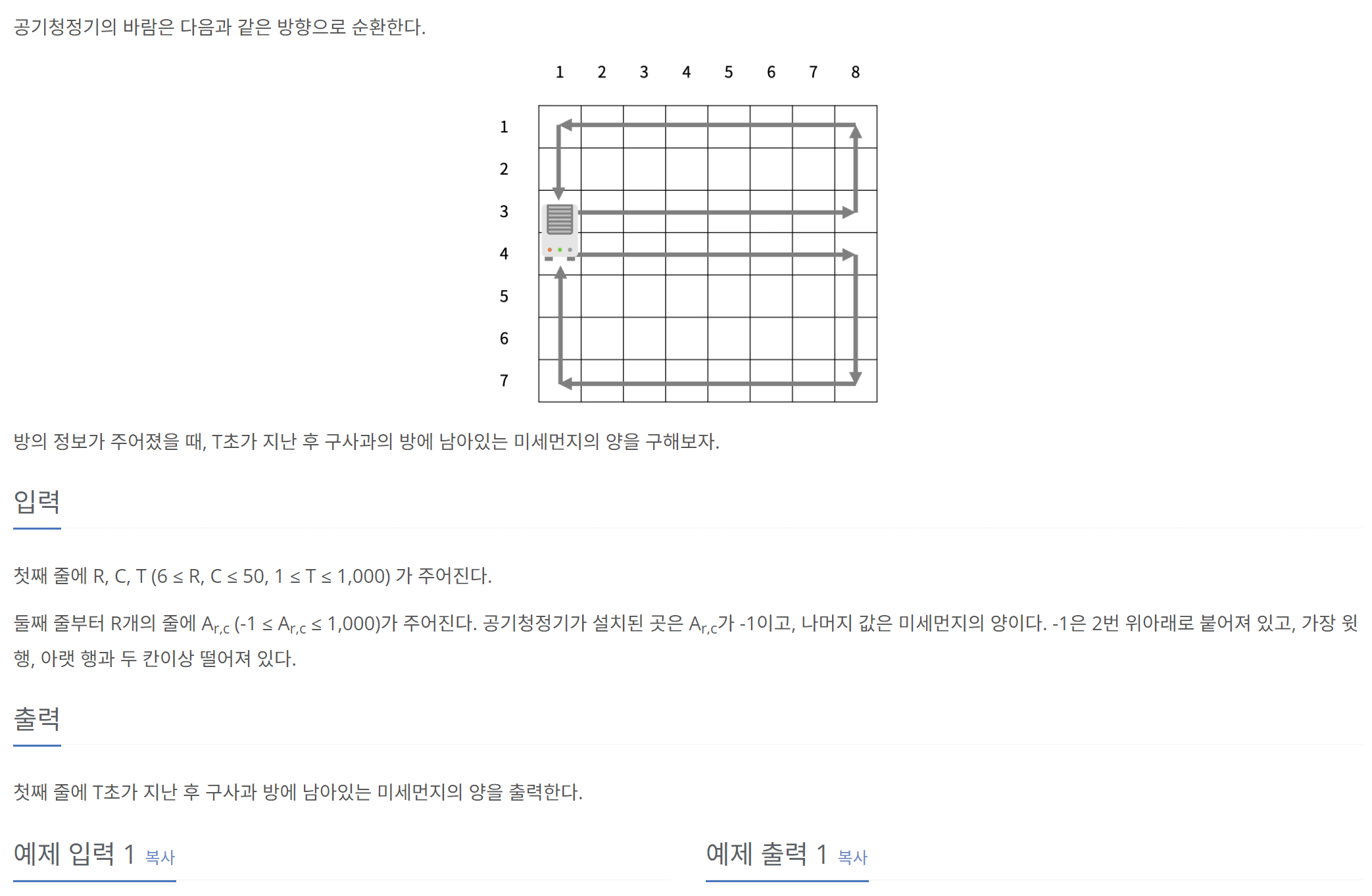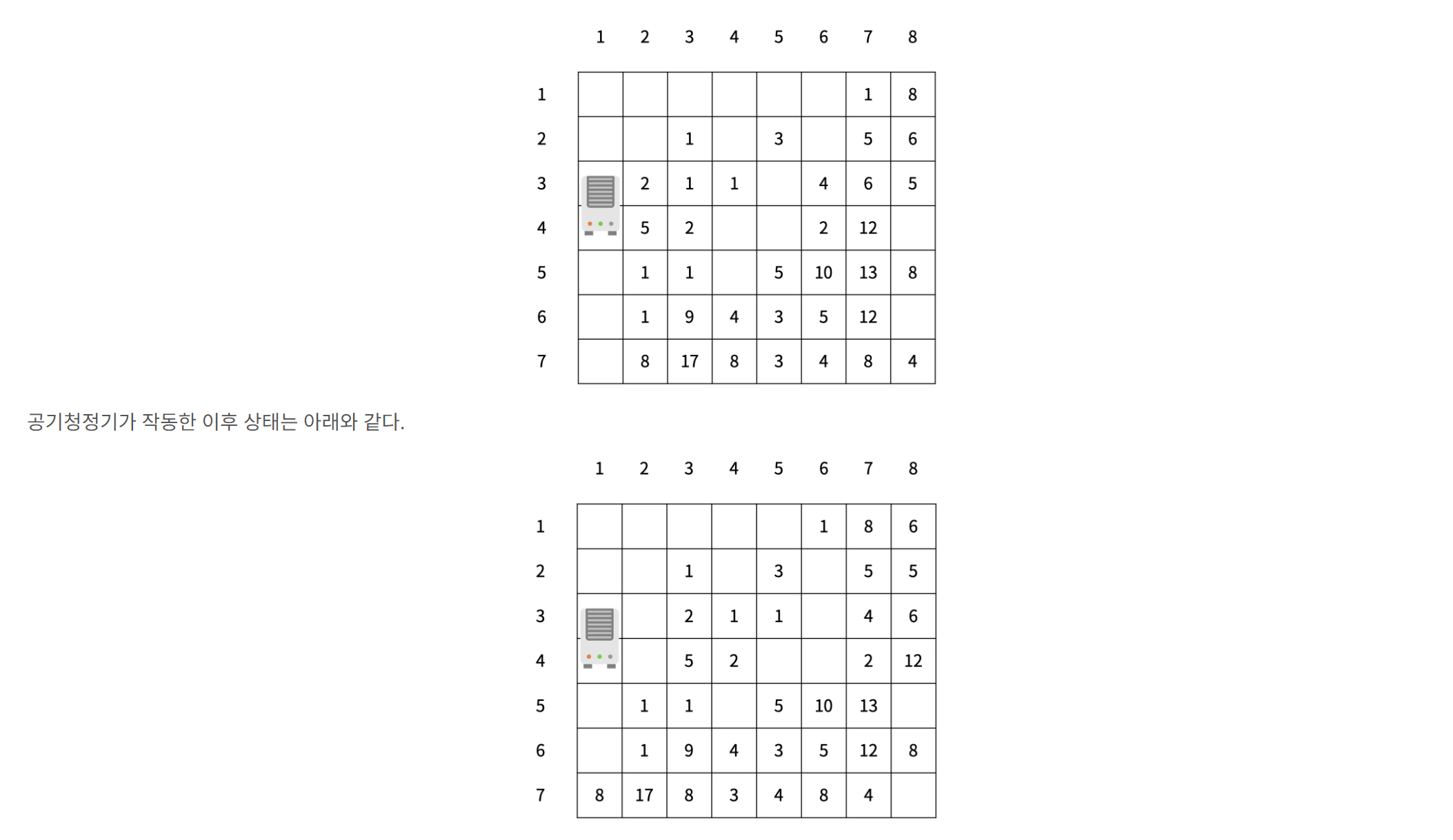 미세먼지를 제거하기 위해 구사과는 공기청정기를 설치하려고 한다. 공기청정기의 성능을 테스트하기 위해 구사과는 집을 크기가 R×C인 격자판으로 나타냈고, 1×1 크기의 칸으로 나눴다. 구사