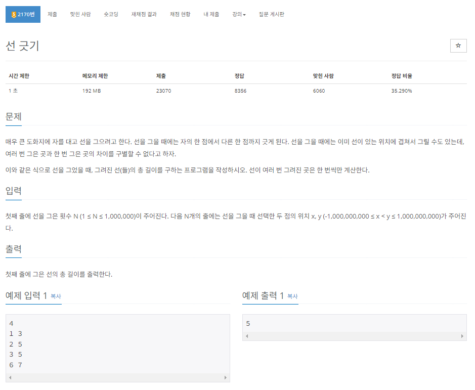 첫째 줄에 선을 그은 횟수 N (1 ≤ N ≤ 1,000,000)이 주어진다. 다음 N개의 줄에는 선을 그을 때 선택한 두 점의 위치 x, y (-1,000,000,000 ≤ x < y ≤ 1,000,000,000)가 주어진다.