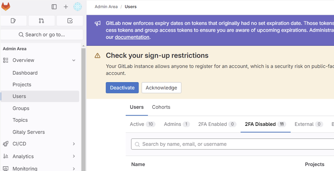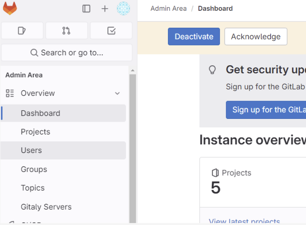Gitlab 페이지 하단의 Admin Area를 클릭한다
