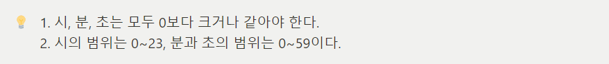 class Time{ int hour; int minute; int second; } Time[] t = new Time[3]; t[0] = new Time(); t[1] = new Time(); t[2] = new Time(); - 시, 분, 초가 하나의 단위로 묶여서 움직이지만, 다음과 같은 추가적인 제약조건이 있다