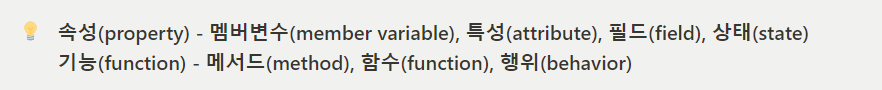 - 인스턴스와 객체는 같은 의미이지만, 객체는 모든 인스턴스를 대표하는 포괄적 의미를 가진다.