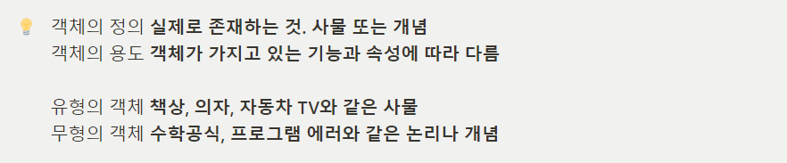 - 프로그래밍에서 객체는 클래스에 정의된 내용대로 메모리에 생성된 것을 뜻한다.