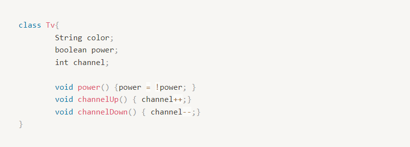 - Tv 클래스를 선언 = 설계도를 작성한 것에 불과, Tv 인스턴스를 생성해야 제품을 사용할 수 있다.