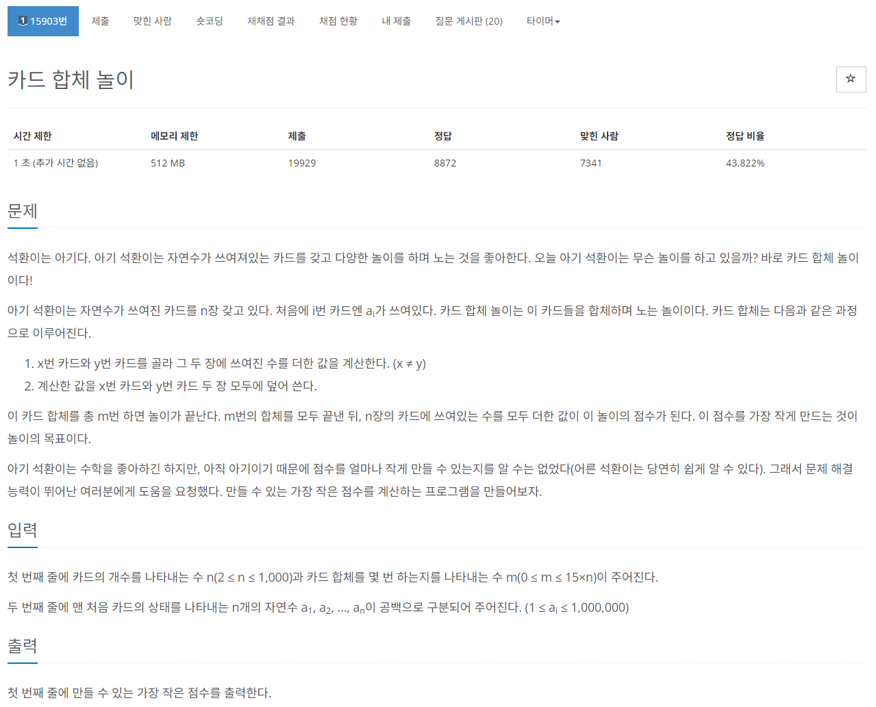 카드의 합을 가장 작게 만드는 법은, 가장 작은 카드끼리 더해서 새로운 합을 만드는 것이다