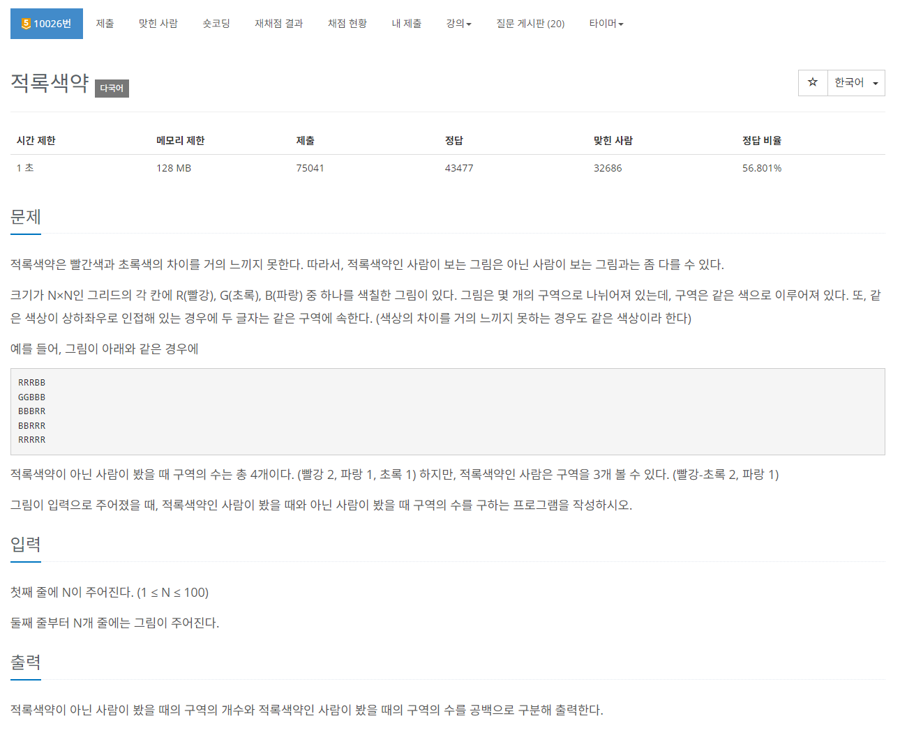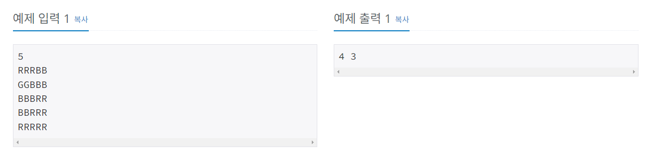 1개는 색약일때, RG를 함께 탐색하는 BFS를 제작하면 된다