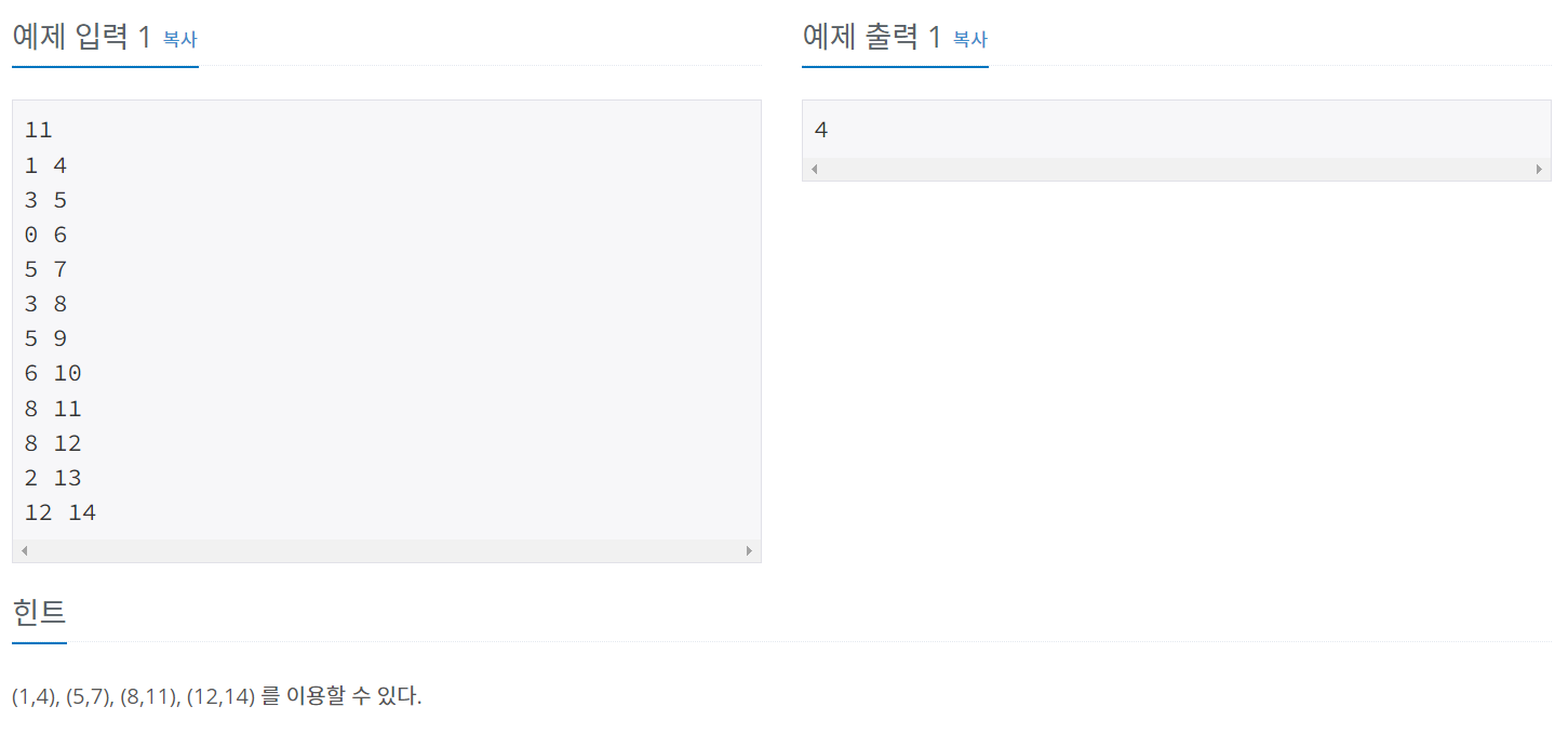 맨 처음의 회의는 항상 포함되니 cnt = 1로 선언하고 endtime은 첫 회의의 종료시간으로 해준다