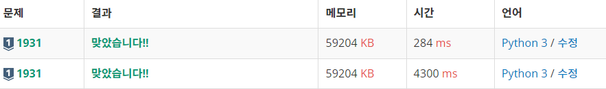 2. 끝나는 시간이 같은 회의시간이 여러개인 경우 : 1번 의 정렬을 마친 후, 시작 시간을 기준으로 오름차순 정렬한다.