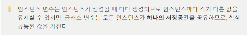 - 독립적인 저장공간을 가지는 인스턴스 변수와 달리 클래스 변수는 모든 인스턴스가 공통된 저장공간을 공유하게 된다.