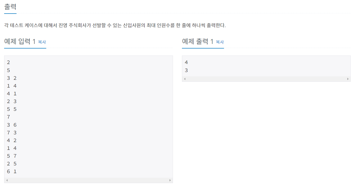 1. 테스트 케이스 입력받기, 지원자 수 입력받기, 지원자 리스트 입력받기