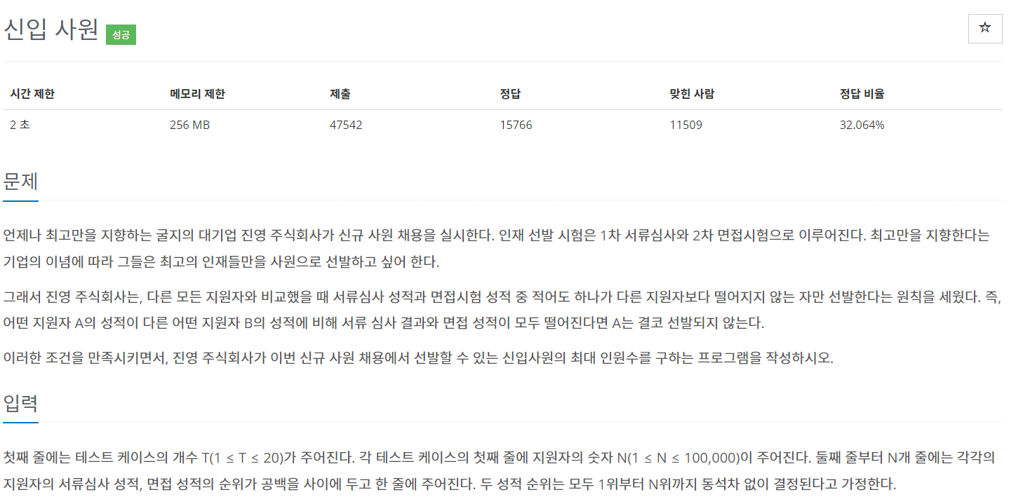 첫 사람의 면접 성적을 min값으로 잡고, 그 다음사람이 min값보다 면접성적이 높다면(즉, 숫자가 더 작다면) count +=1을 하고 min값을 다음사람의 값으로 대체해준다.