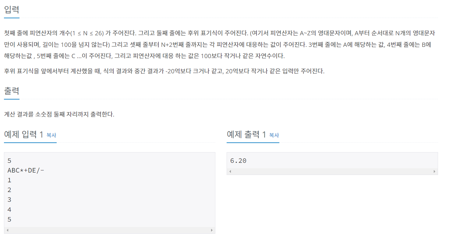 첫째 줄에 피연산자의 개수(1 ≤ N ≤ 26) 가 주어진다. 그리고 둘째 줄에는 후위 표기식이 주어진다. (여기서 피연산자는 A~Z의 영대문자이며, A부터 순서대로 N개의 영대문자만이 사용되며, 길이