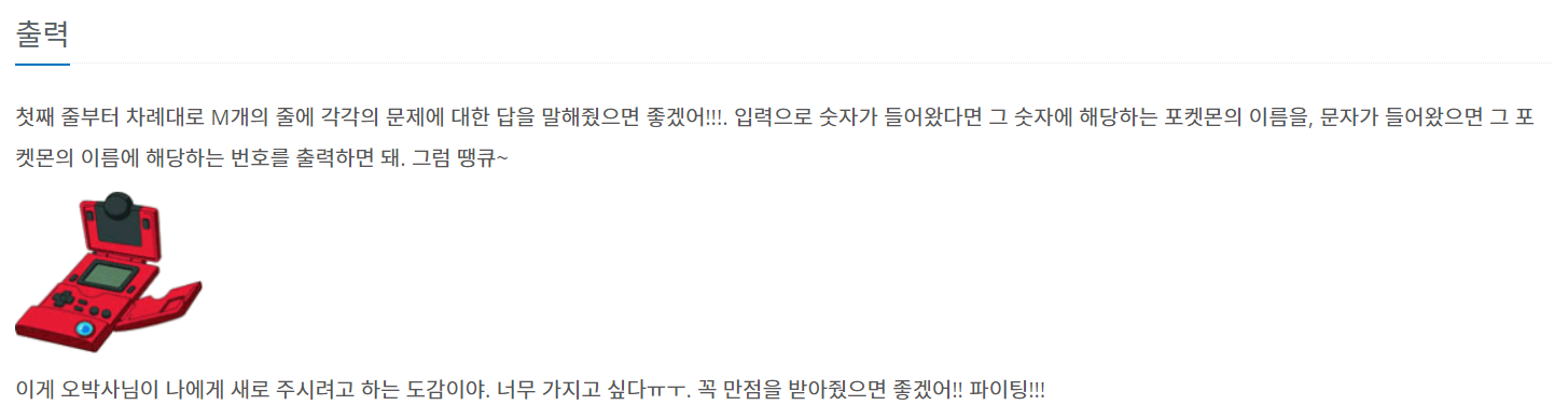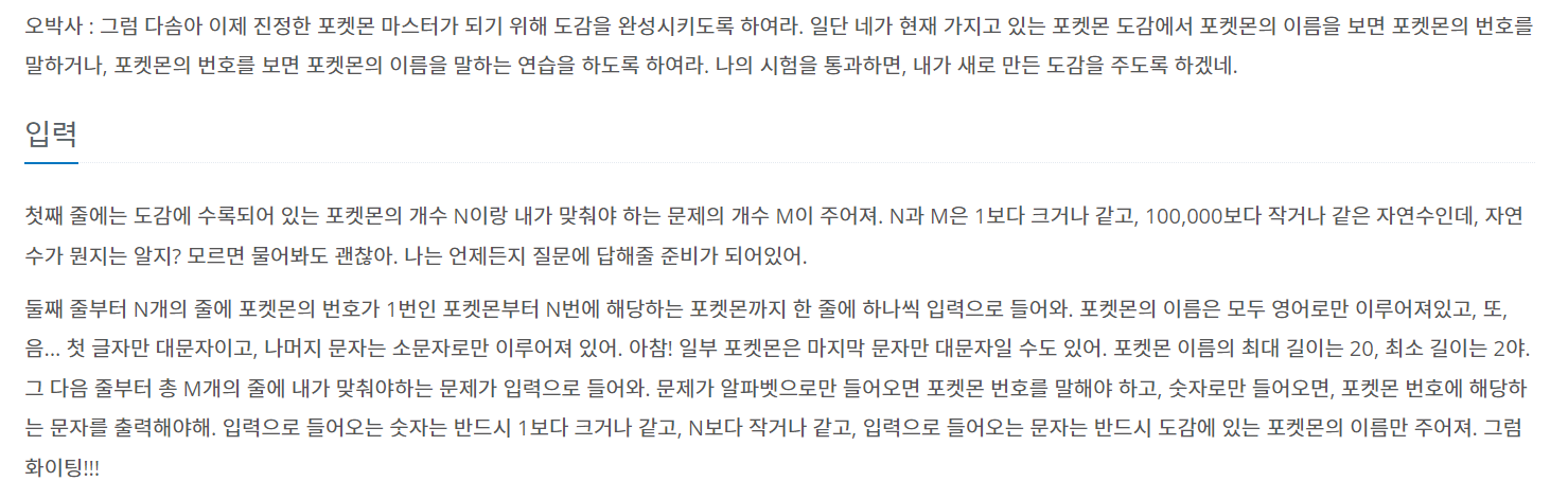 첫째 줄에는 도감에 수록되어 있는 포켓몬의 개수 N이랑 내가 맞춰야 하는 문제의 개수 M이 주어져. N과 M은 1보다 크거나 같고, 100,000보다 작거나 같은 자연수인데, 자연수가 뭔지는 알지? 모르면