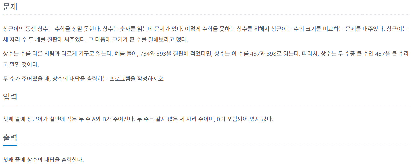 상근이의 동생 상수는 수학을 정말 못한다. 상수는 숫자를 읽는데 문제가 있다. 이렇게 수학을 못하는 상수를 위해서 상근이는 수의 크기를 비교하는 문제를 내주었다. 상근이는 세 자리 수 두