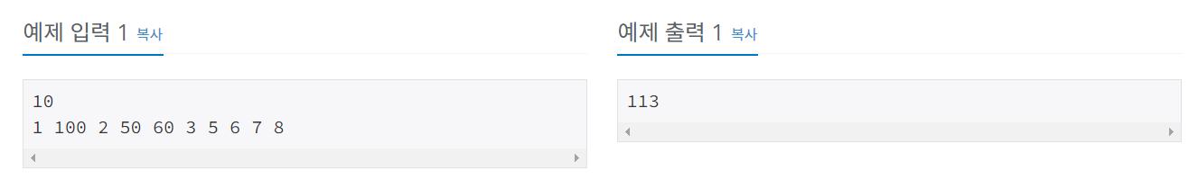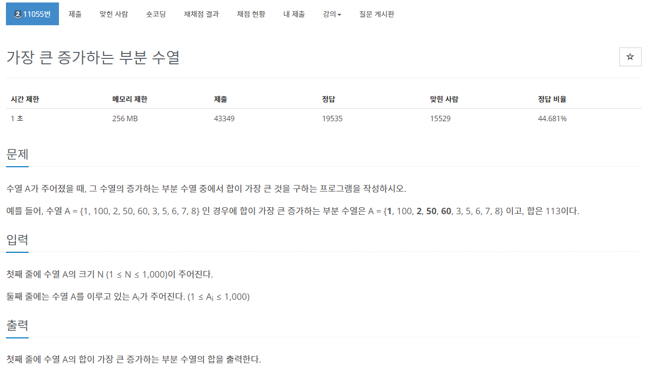 수열 A가 주어졌을 때, 그 수열의 증가하는 부분 수열 중에서 합이 가장 큰 것을 구하는 프로그램을 작성하시오. 예를 들어, 수열 A = {1, 100, 2, 50, 60, 3, 5, 6, 7, 8} 인 경우에 합이 가장 큰 증가하는