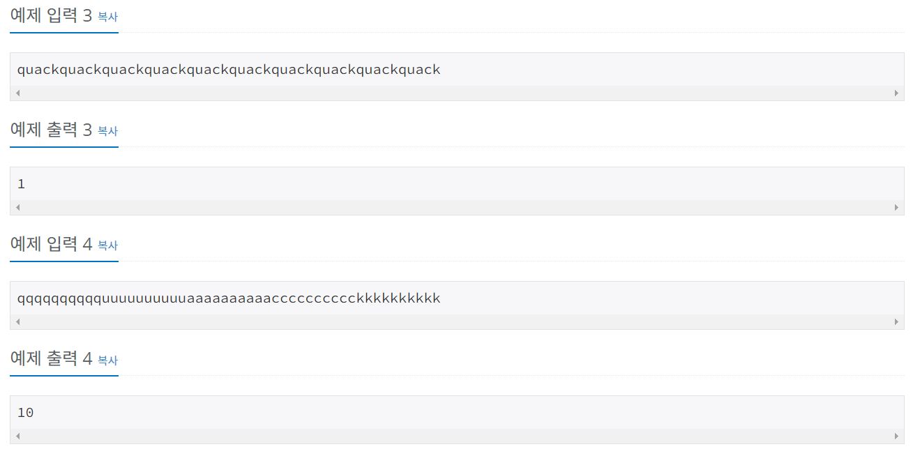첫째 줄에 영선이가 녹음한 소리가 주어진다. 소리의 길이는 5보다 크거나 같고, 2500보다 작거나 같은 자연수이고, 'q','u','a','c','k'로만 이루어져 있다.