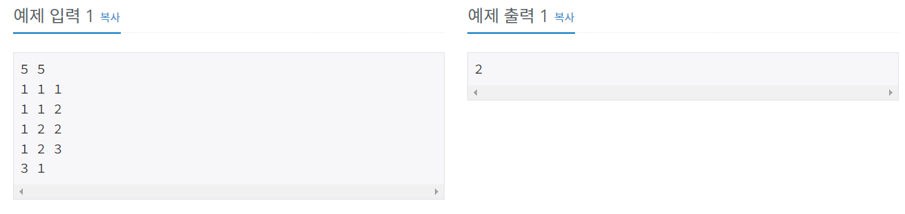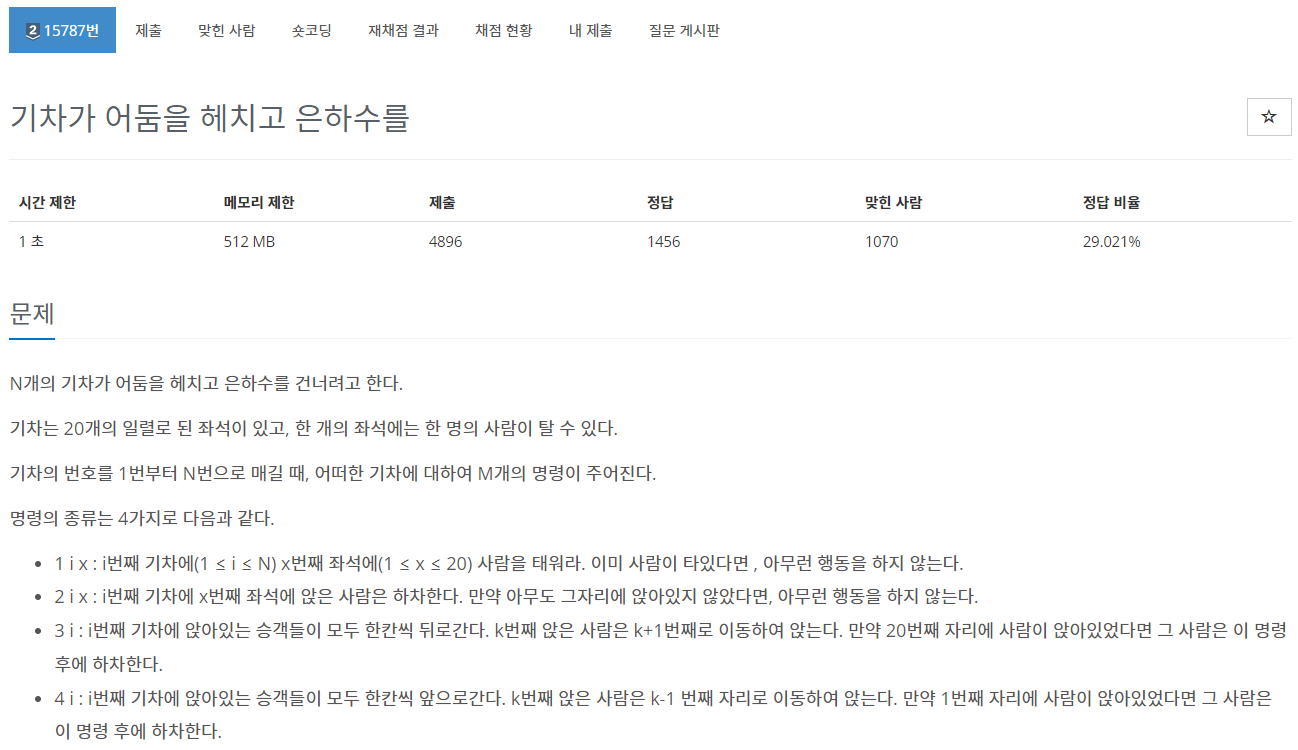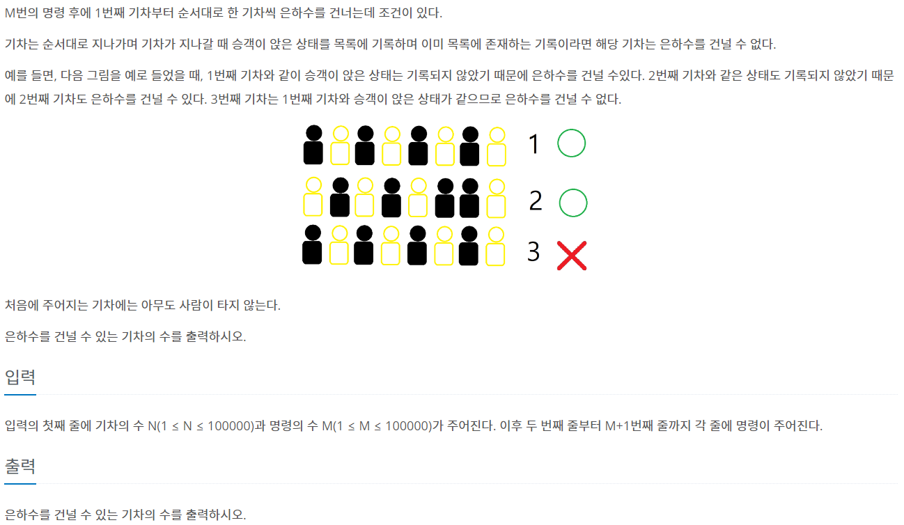 입력의 첫째 줄에 기차의 수 N(1 ≤ N ≤ 100000)과 명령의 수 M(1 ≤ M ≤ 100000)가 주어진다. 이후 두 번째 줄부터 M+1번째 줄까지 각 줄에 명령이 주어진다.